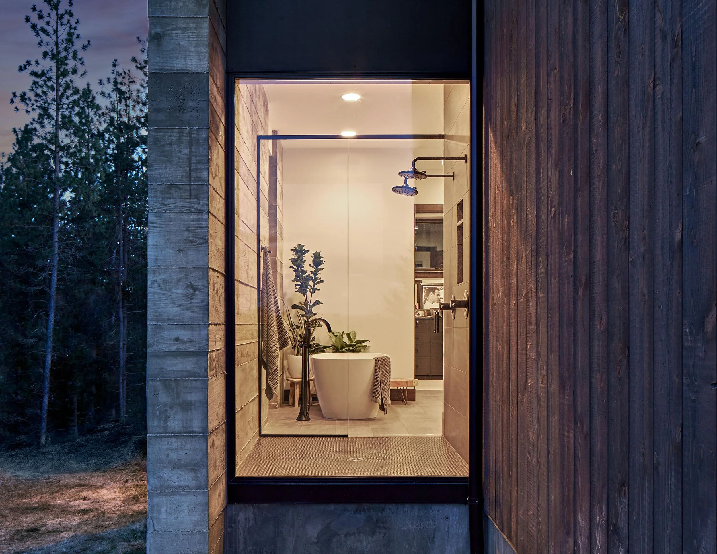 The home is constructed from a restrained palette of glass, locally sourced Douglas fir, and board-formed concrete. These materials were selected to complement the wooded setting while providing privacy and durability.